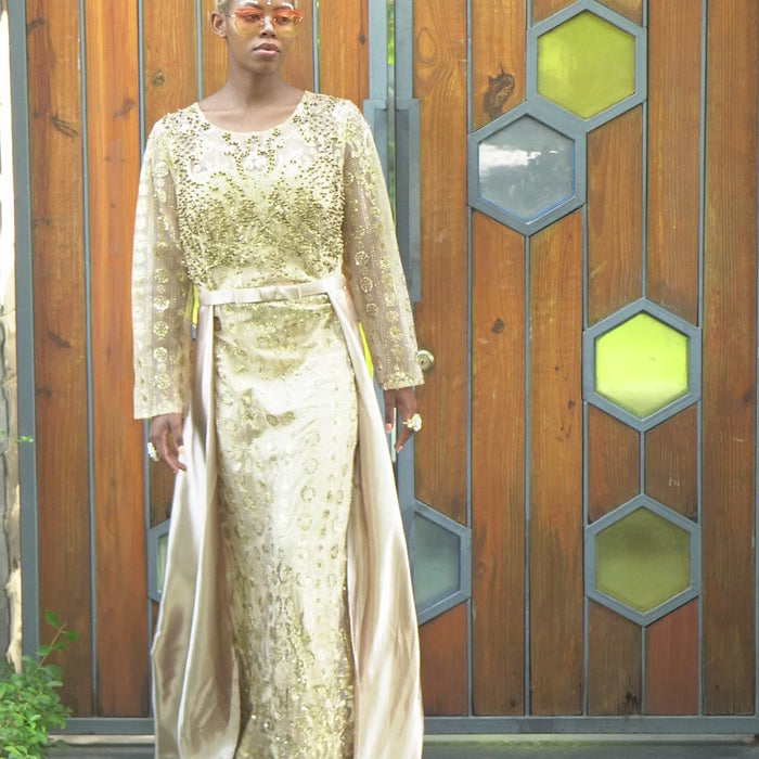 Floor-length golden ball gown designed with an aura of opulence and elegance. The gown features a fitted bodice adorned with intricate embroidery and embellishments, creating a shimmering, luxurious texture