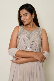 A georgette lehenga featuring intricate embroidery and mirror work, paired with a simple, elegant plain dupatta, comes with attached selves.