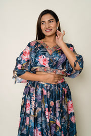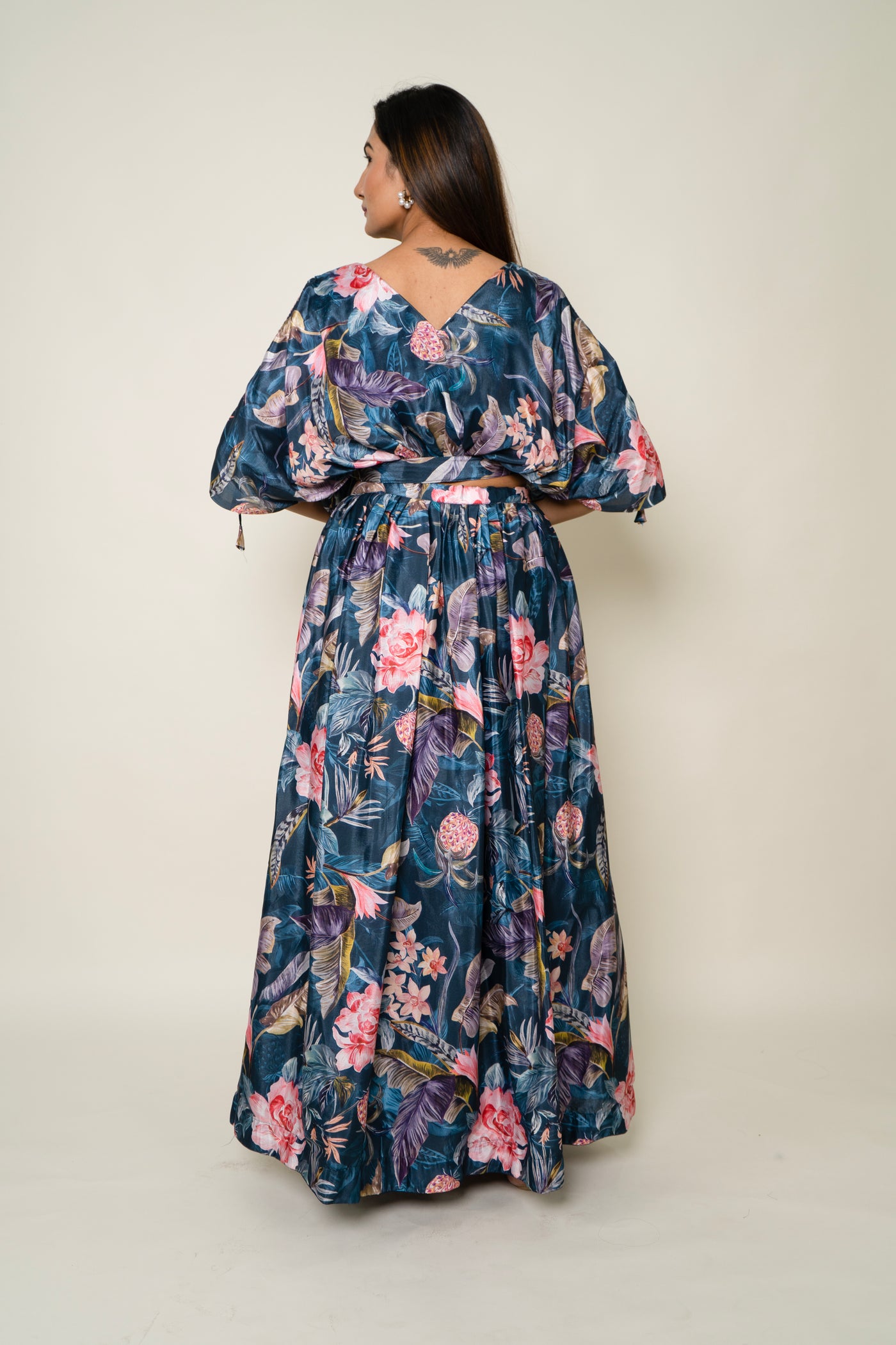 Floral skirt with cotton satin fabric paired with matching crop top.