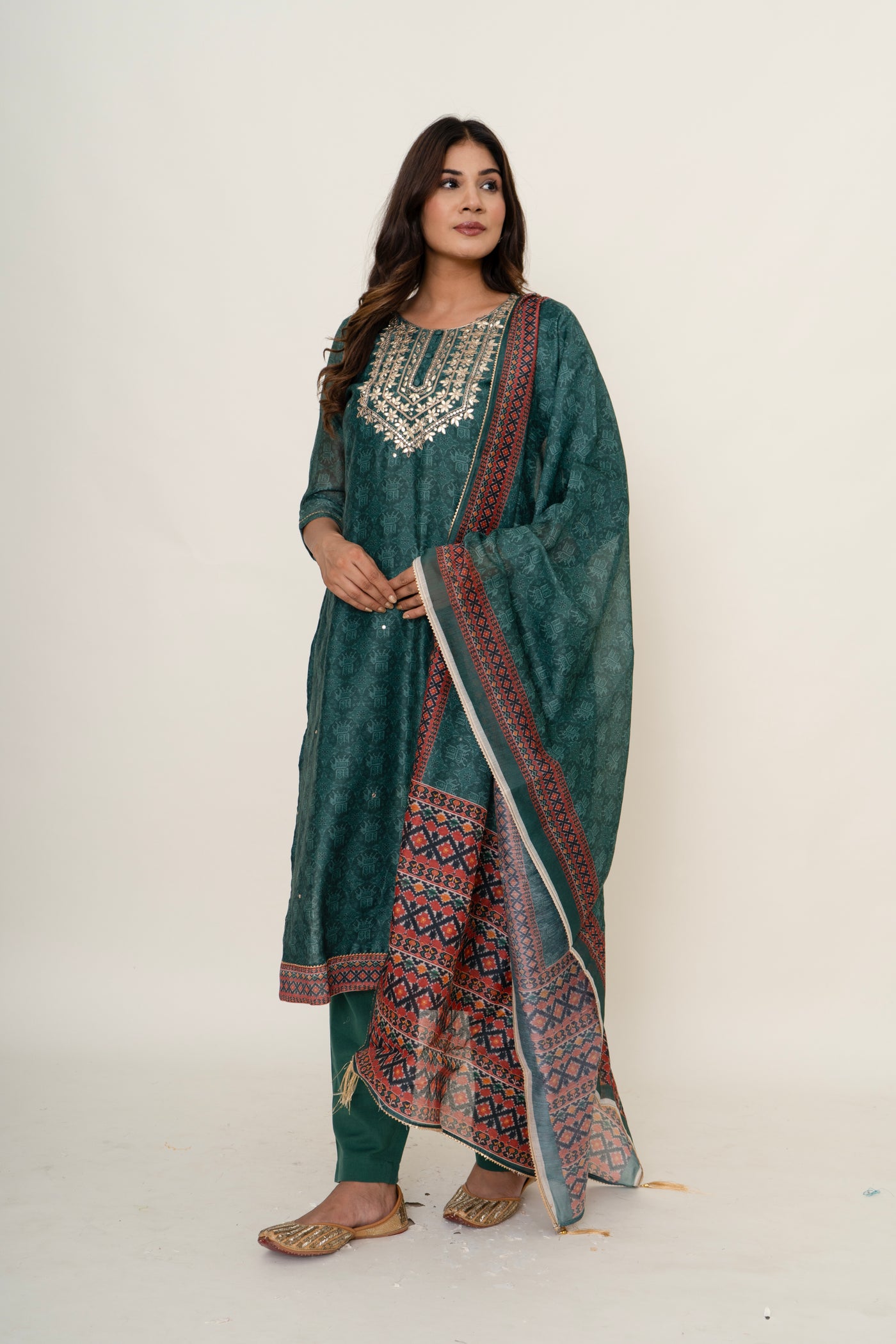 Our 3-piece green printed suit set features a straight-fit kurta with a round neckline and half sleeves. Complemented with palazzos with a partially elasticated waistband, and a dupatta. Adorned with piping and fabric-trim accents, this style is perfect for elevated everyday wear.